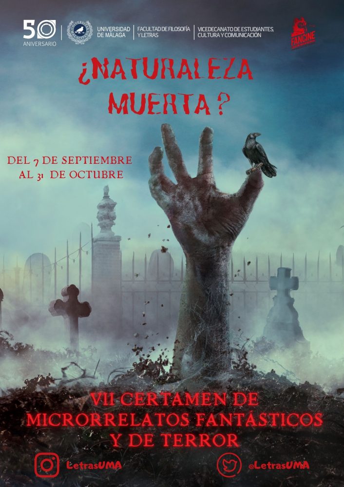 - Las obras se enviarán a la dirección de correo electrónico estudiantesyculturaletrasfil@uma.es. En el asunto deberá figurar “Terror Letras” y en dicho mensaje de correo electrónico se habrán de adjuntar dos archivos, uno de ellos con el título del microrrelato —donde se incluirá el texto objeto del concurso— y otro, con la denominación «Plica», donde se harán constar el título del relato y los datos personales del autor (nombre, apellidos, teléfono, correo electrónico, dirección, código postal, localidad y su relación con la Universidad de Málaga).